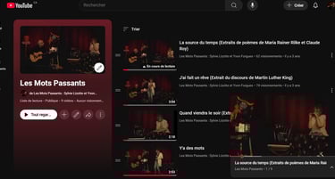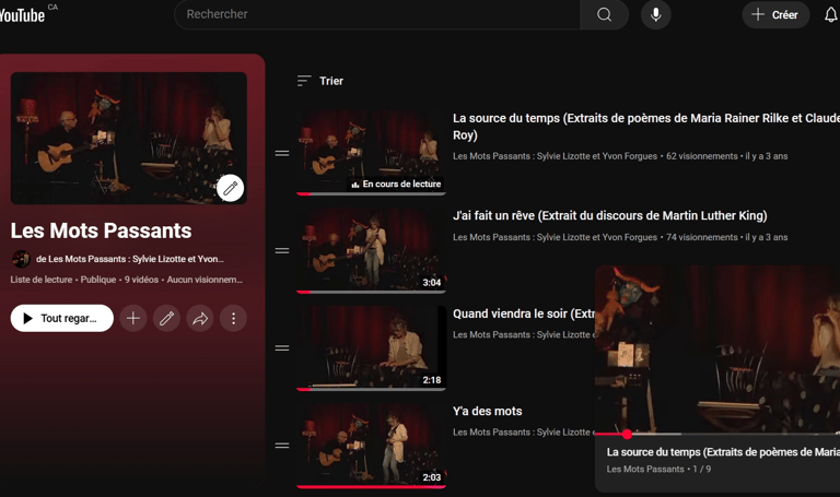 Découvrez sur notre chaîne YouTube neuf extraits du spectacle "Les Mots Passants", mettant en vedette Sylvie Lizotte et Yvon Forgues. Ces vidéos, diffusées sur le site Facebook "Quartier Général Virtuel" de la ville de Salaberry-de-Valleyfield, offrent un aperçu unique de cet événement artistique. Ce projet a été réalisé grâce à la collaboration de Valspec et du Café Culturel La Fractrie, où le spectacle a été enregistré. Plongez dans cet univers poétique et engageant. Venez apprécier le talent et la créativité qui se dégagent de ces performances vibrantes !