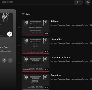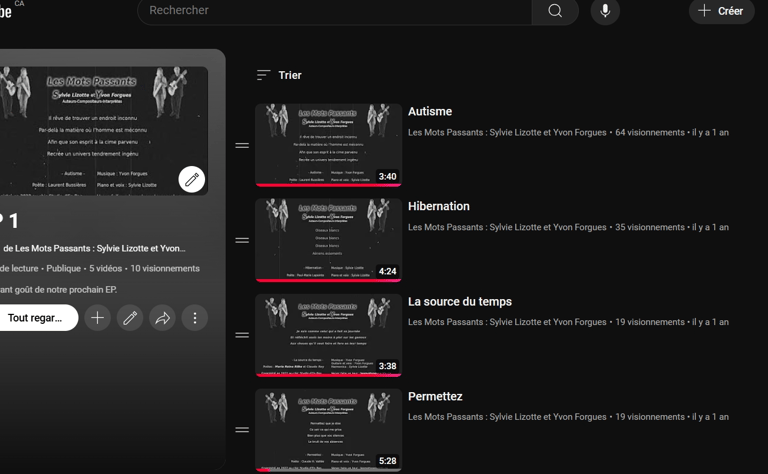Notre EP, intitulé "La Maux de l'Âme", présente cinq chansons captivantes mettant en vedette les talents de Sylvie Lizotte et Yvon Forgues. Chaque morceau explore des thématiques profondes et émouvantes, offrant une réflexion sur les blessures de l'âme et les expériences humaines. Nous vous invitons à découvrir ces créations sur notre chaîne YouTube, où les vidéos mettent en avant les paroles de chaque chanson. Plongez dans cet univers musical et laissez-vous transporter par les mélodies et les émotions qui en ressortent.